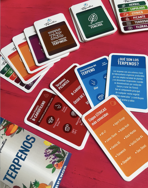 46 cartas terpenautas con info detallada de los principales terpenos de la planta.